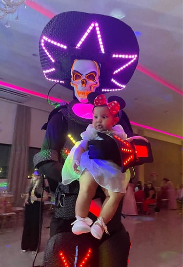 Interação com luzes, danças e presença marcante que anima qualquer evento.